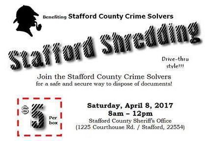 Shredding Event – The event is sponsored by Stafford County Crime Solvers. This easy and convenient drive-thru event is the perfect way to destroy sensitive documents, old bank statements, tax records, etc. A contribution of $5 per box will benefit the good work that Stafford County Crime Solvers in our community.
